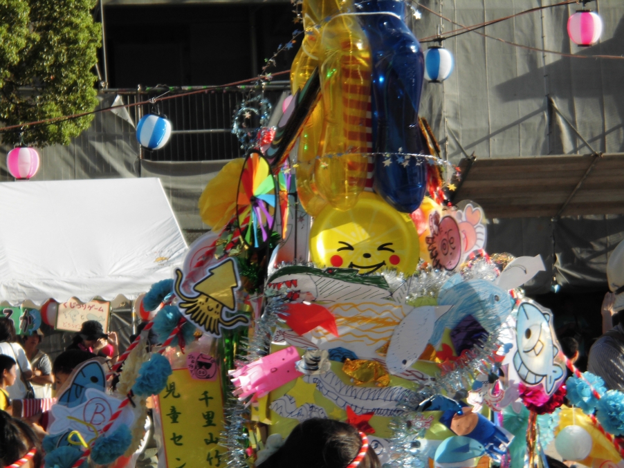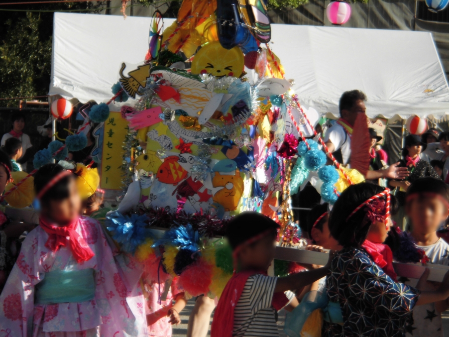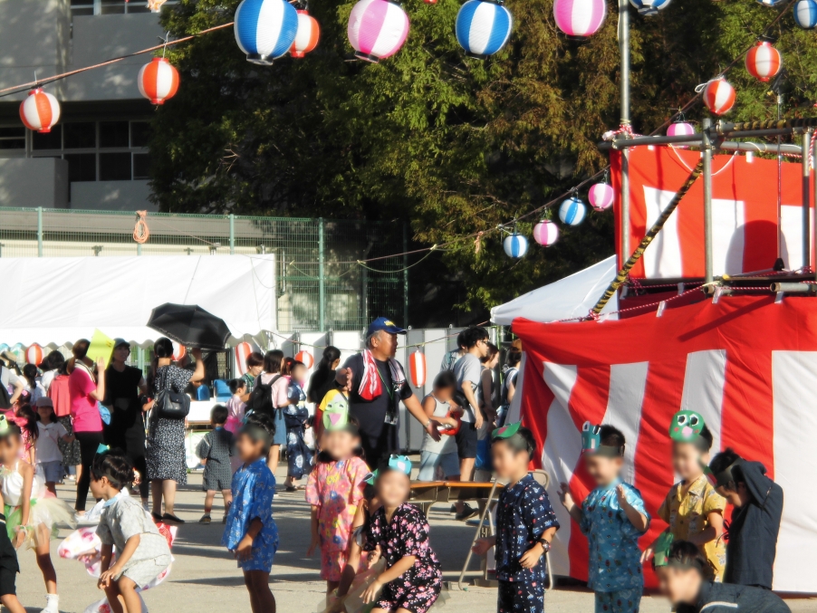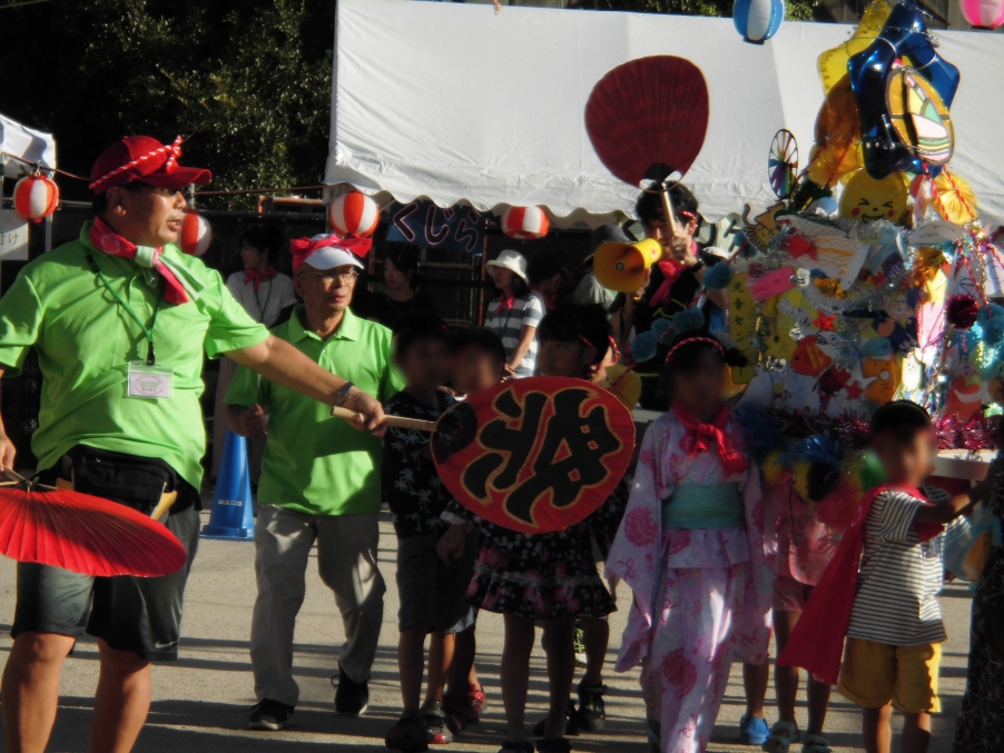 祭りのスタートは、元気なこどもたちが担ぐおみこしの練り歩きです。今年は10年余りお世話になった手作りのおみこしを一部リニューアルしての登場でした。開会宣言の後、やぐら前では、こどもたちを中心としたダンス・バトン・歌・けん玉などのイベントが披露され、千新小先生方のバンドの登場で盛り上がりは最高潮に!わが子を応援する保護者、先生方のパフォーマンスにくぎ付けのこどもたちの姿も印象的でした。