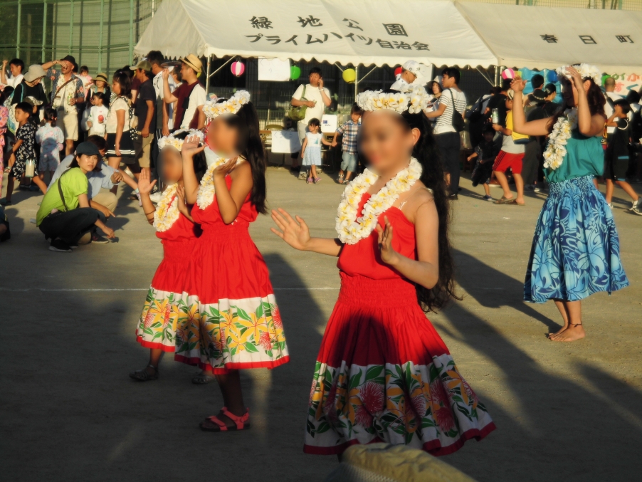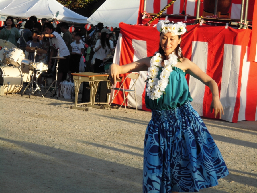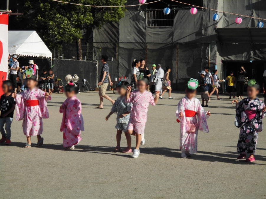 グランド・ピロティでは、地域、PTA、児童会・生徒会等が運営する食べ物屋さん・ゲーム屋さん等の店舗が軒を並べ、どのお店にもわくわく感たっぷりのこどもたちが長蛇の列をつくっていました。軽快な囃子太鼓のリズムとともに恒例の盆踊りをみんなが楽しむ中、日が暮れてくると、いよいよクライマックスの花火大会。こどもたちの「ウォー」「すご~い」との感嘆の声とともに、楽しい夏祭りのエンディングを迎えました。
