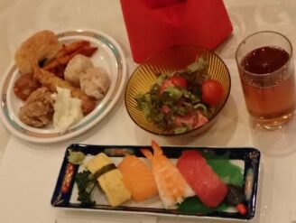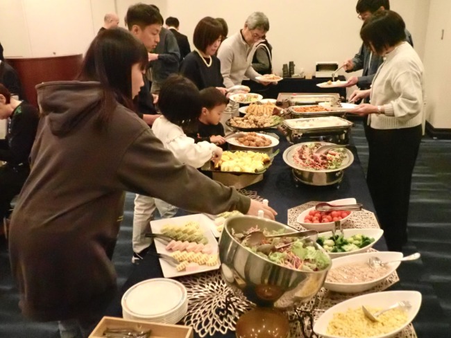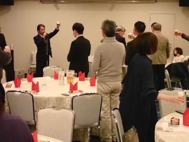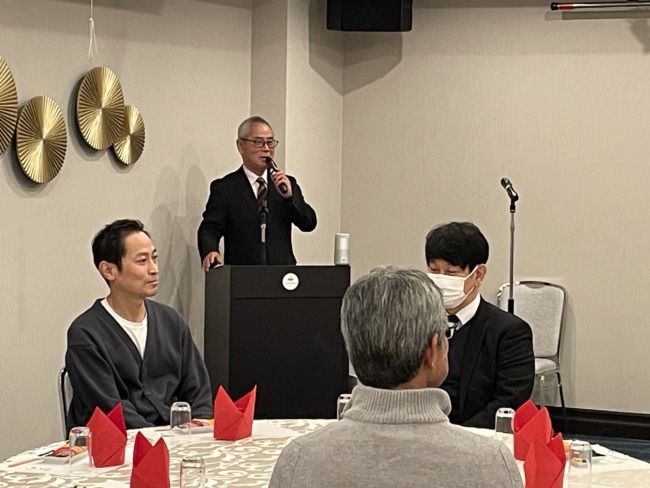 はじめに福間会長による年頭のあいさつがあり、続いてご来賓のごあいさつを頂き、その後、野中副会長の乾杯の発声で新年交換会が始まりました。歓談の時間には、テーブルごと、またテーブルの枠を越えて、新年のあいさつや近況報告が交わされ、会場のあちこちで交流が深められていました。