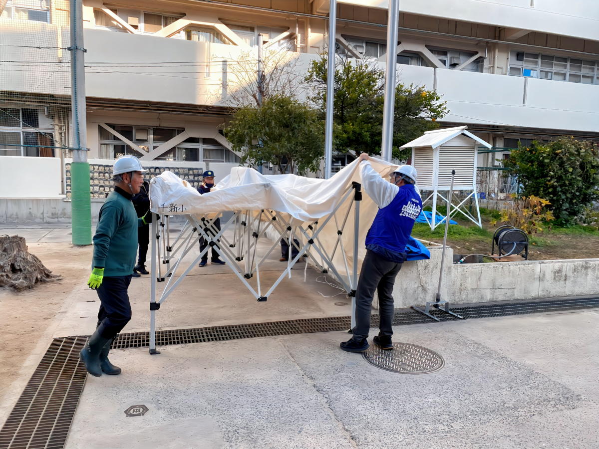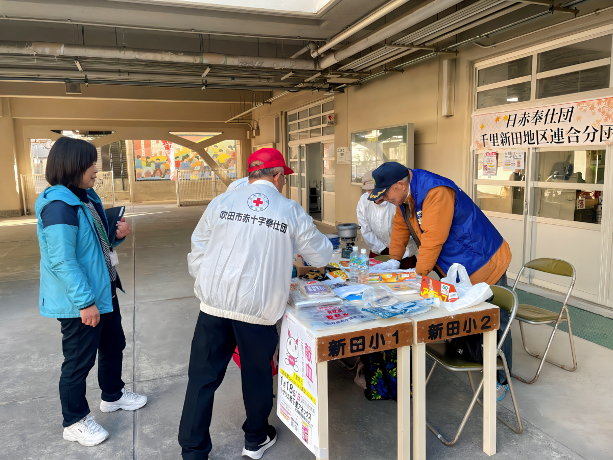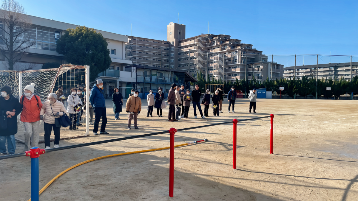 令和8年1月18日(日)午前9時30分、上町断層帯を震源としたマグニチュード7.5の直下型地震が発生し、吹田市全域で震度6強、断層付近の一部地域で震度7の大地震に襲われたとの想定で、連合自治会を中心とした各自治会での避難訓練とまちづくり協議会による合同防災訓練を千里新田小学校で実施しました。