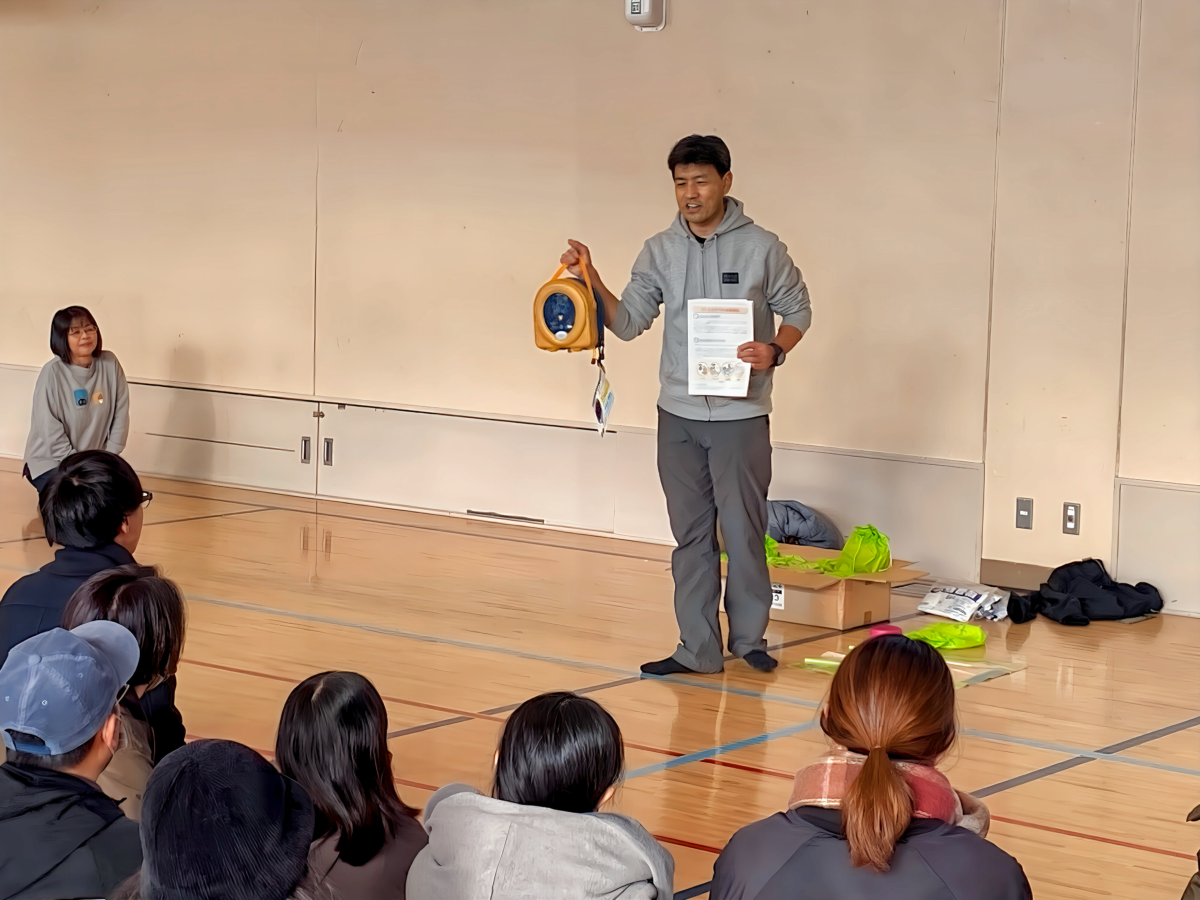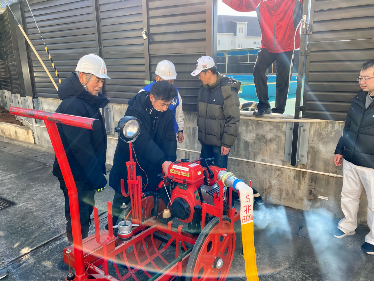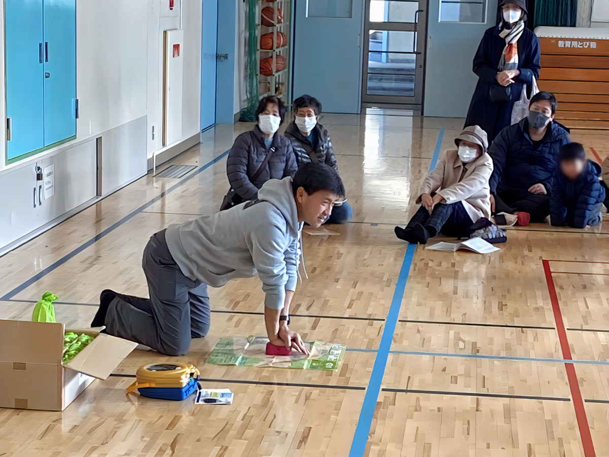 当日は、可搬式消防ポンプを使用した放水訓練と参加者による水消火器の操作実演を行いました。また、小学校の体育館において、教頭先生の指導のもとに「AED (自動体外式除細動器)の説明と疑似AEDキット (ハートの形をした心臓部)を使った心臓マッサージ訓練」と「体育館が避難所になった場合に、館内に設置する簡易テントの紹介」がありました。学校側の配慮で暖房も入っていたので、和気あいあいとした様子で、訓練に加えて、地域の交流が促進されました。
