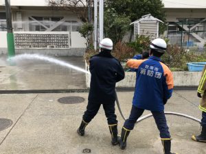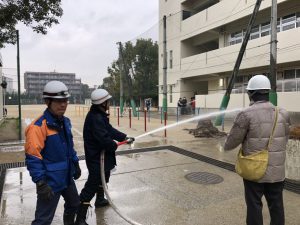 - 地震直後に小学校西門付近から火災が発生したとの想定で、連合自治会防火部が可搬式消防ポンプによる放水訓練を行うとともに、小学校設置の消火装置でも放水を行いました。