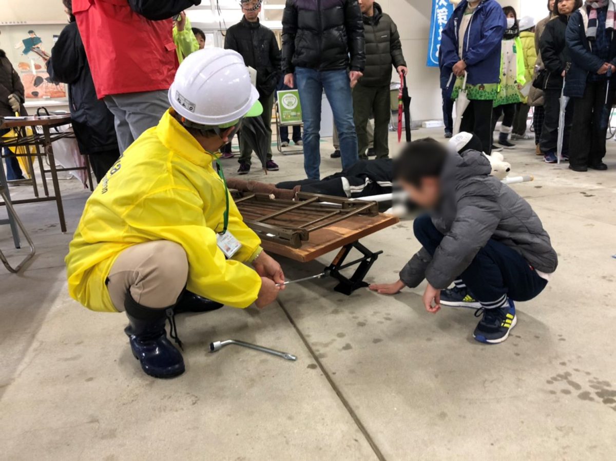 - 今年初めての取組として車のジャッキを使い救出する訓練を行いました。家具の下敷きになった人がいた場合に有効な救出する手段として、車に常備されているジャッキで救出が可能なので、その使用方法などを説明し、ダミーの人形を使ったデモンストレーションを行いました。非常に関心が高く、ジャッキの周りは人だかりとなりました。