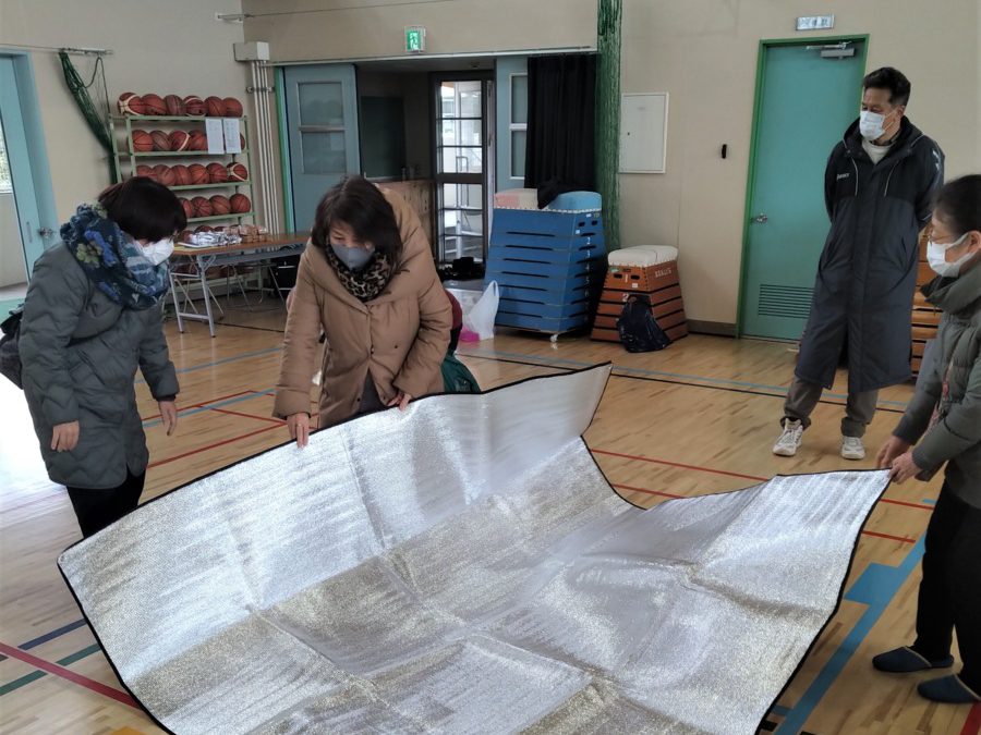 コロナ禍の環境下のため、千里新田地区の皆さんが集まって吹田市一斉防災訓練を行うことが出来なかったので、1月30日(日)朝10時から、千里新田地区連合自治会主催で各単一自治会会長とまち協・各種団体役員を中心とした避難所講習会を千里新田小学校の体育館で開催しました。吹田市·危機管理室職員の指導のもと、千里新田小学校の宮本校長も参加されて寒い中を30人の皆さんが真剣に取り組みました。