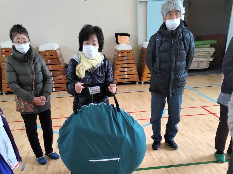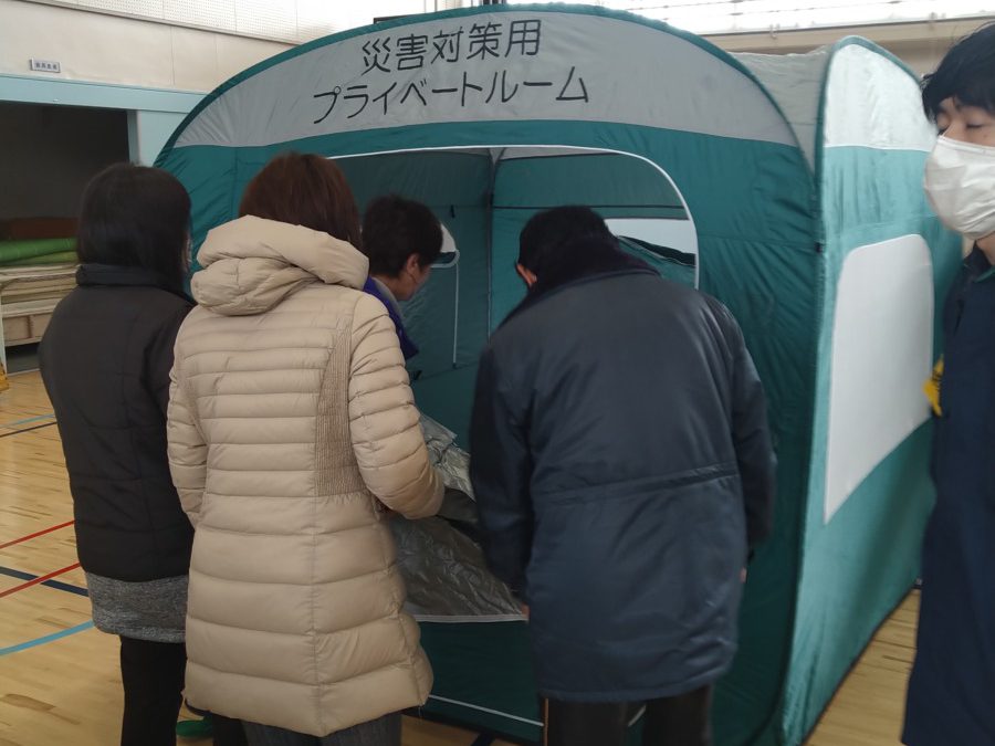 まず初めに、大型スクリーンで避難所での避難に関する基礎知識を学びました。続いて、避難所での各家庭単位の生活をイメージして作られた災害対策用パーテーションを、避難倉庫より取り出して組み立てを行ない、パーテーションの中での暮らし模擬体験をした後、パーテーションを畳んで袋に仕舞う訓練も実施しました。皆さん誰もが初めての体験だったようで、「思ったより軽いね」、「床も思ったより冷たくないね」、「組み立てる時は簡単だったけど、袋に折り込んで仕舞うのが難しい(汗)」とかその他、様々な感想がありました。最後には、いざという時に使えるよう、何処に保管しているかを確認するため、皆で防災倉庫に行って保管場所を確認しました。