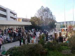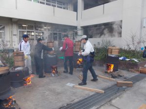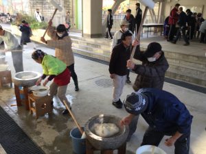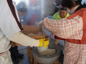 昨年は、開催する日程前にノロウイルスがはやり、余儀なく、中止と致しました。今年度こそは、開催する意気込みで臨み、当日は、晴天に恵まれ、盛大なもちつきフェスタとなりました。