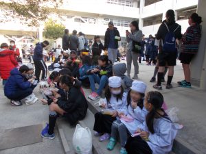 前日(19日)昼から、もちつき実行委員の方々が、準備をし、当日も早朝から準備をしていただき、子どもたちの受け入れ態勢も整えてもらい、9時からもちつきがスタートいたしました。又、9時からは、スタッフの応援として、中学生の部活メンバーと先生方が駆けつけてくれて、(野球部・陸上部・サッカー部・テニス部・茶道部)各々役割分担に分かれ、お手伝いをしていただきました。9時過ぎから、小学生の子どもたちも集合し、頬が、はち切れんばかり、お餅をたべていました。また、食べた後は、もちつきに参加をしてもらい、杵を大きく振りかざしお餅をめがけてうまくついていました。又、一般の参加者の方々ももちつきに参加してもらい、子どもさんと一緒に餅をつき、カメラに収めておられました。疲れたかと思えば、次のつき手と変わり、休むことなく、順調に進めることが出来ました。