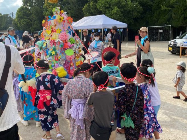 夏祭りの開催に景気を付ける為に、まず、お御輿をかついで会場を練り歩きました。こども園の園児、千新小の児童、お御輿製作委員会の皆さんが、暑い中、それぞれの御輿に自由に飾り付けをし、一生懸命作成に取り組まれ、立派な御輿が出来上がりました。保護者の皆様も一緒に会場内を練り歩き、盛大な夏祭りの幕開けとなりました。また、盆踊りでは、櫓の周りにできた踊りの輪に次々と老若男女が参加され、大変盛りあがりました。