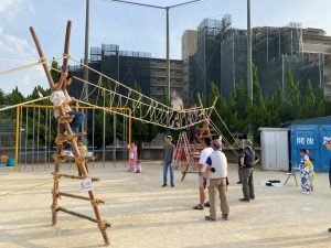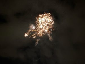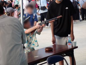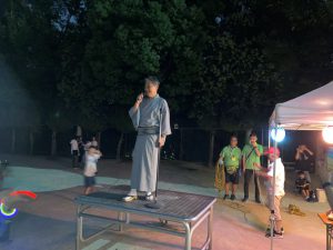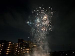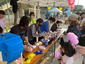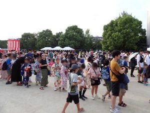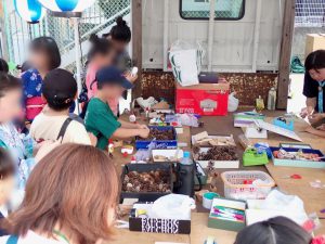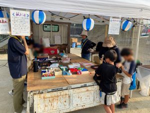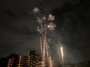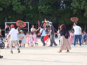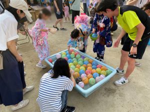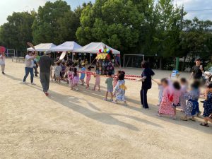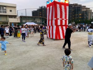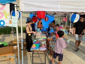 祭りが始まると、こどもたちのお目当ては模擬店です。保護者や友達と一緒に会場を回るこどもたちは、皆、笑顔いっぱい。グラウンドの周りには、各種団体によるゲームコーナーや飲食店が立ち並び、長い行列ができるほどの盛況ぶりでした。祭りの終盤には、昨年から設置された櫓を中心に盆踊りが行われました。事前に練習会に参加したこどもたちも、初めての踊りを楽しんでいる様子でした。そして、フィナーレを飾ったのは、夜空を彩る花火。子どもたちの笑顔を一層明るく照らしました。