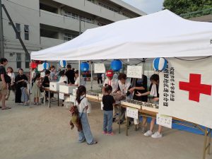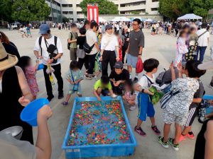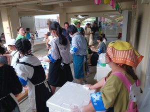 今年度から「千新小夏まつり」から「千新夏まつり」へと名称が変更されました。これは、小学生だけでなく、中学生、園児も参加する地域のお祭りとして、その意義を再確認するためです。この思いは、それぞれの実行委員の具体的な取り組みによって形になりました。小学校からは、小学生が企画・運営する店舗の提案があり、自分たちで飲み物を選び、値段を決めて販売する店舗ができました。また、中学校の生徒会とPTAの働きがけにより、14の中学生がボランティアとして参加し、大人と一緒に店舗運営や会場設営に汗を流しました。こどもたちを中心に、地域全体で作り上げる夏祭りへと、少しづつ進歩しているのではないかと思います。来年もまた、こどもたちの笑顔で溢れることを願っています。