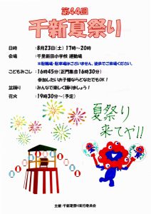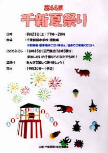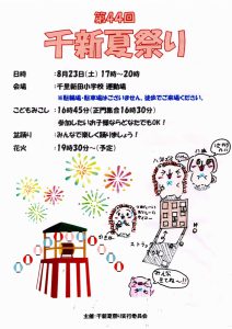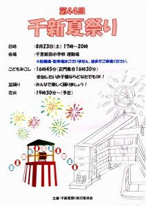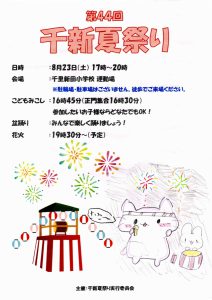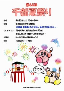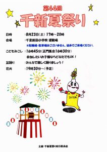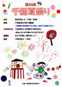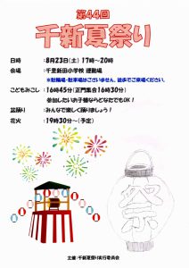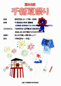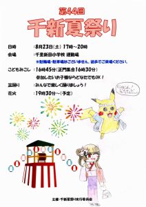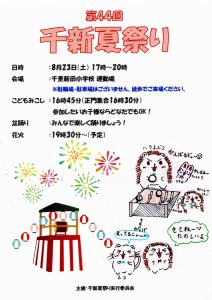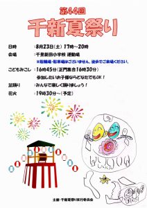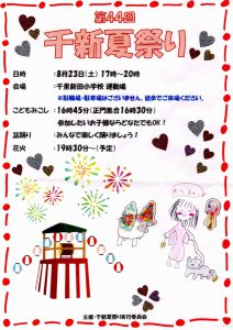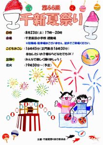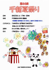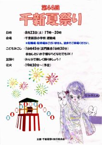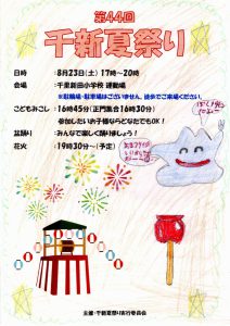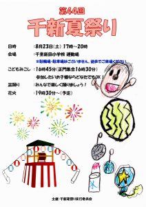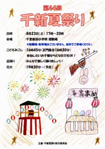 まち協だより 「第44回千新夏祭り」のポスター紹介 2025.07.07 【千里新田小学校の児童が書いてくれた夏祭りのポスターを一挙ご紹介】 画像をクリック(タップ)すると拡大表示され、左右にスクロール(スワイプ)してご覧いただけます。