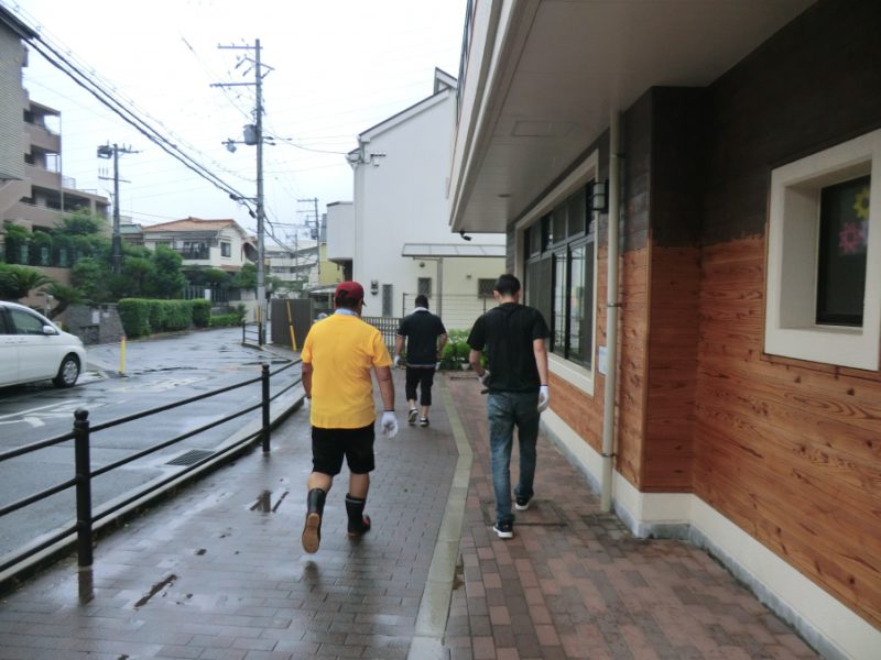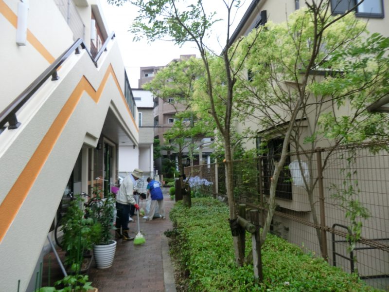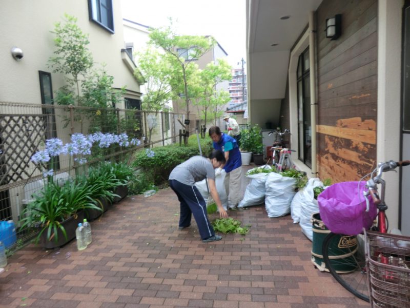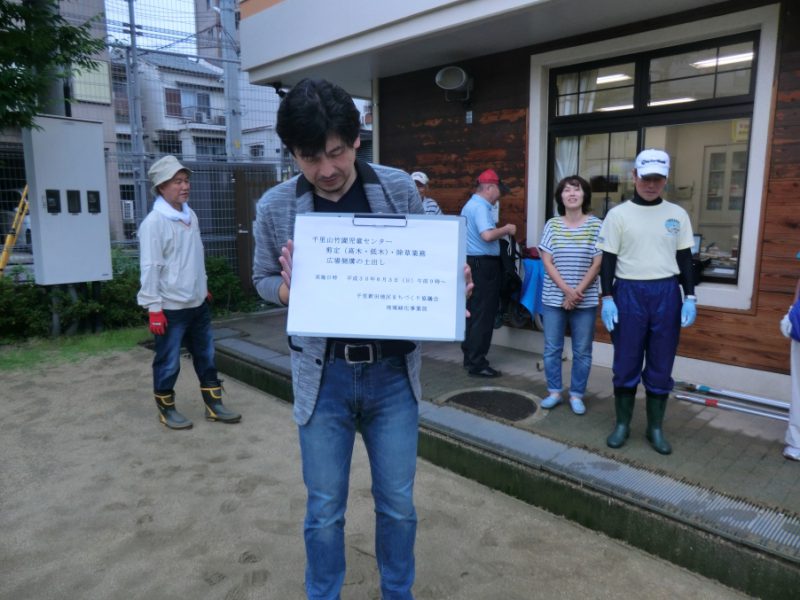 大雨予想の中で実施が危ぶまれましたが、児童センターの除草・剪定・側溝の清掃を行いました。9時に集合をかけましたが、今にも雨が降りそうです。役員会で協力を呼びかけたものの、人が集まるかどうか不安でした。しかし、なんと9時には17人のメンバーがそろいました。頼もしいまち協です。小学校や中学校のPTAの会長さんもご協力いただきました。まち協の地域環境美化事業の担当役員OさんとMさんの指示のもと、それぞれ手分けして作業を開始しました。10時30分には大雨が降りそうなので、それまでの短い時間集中して取組みました。