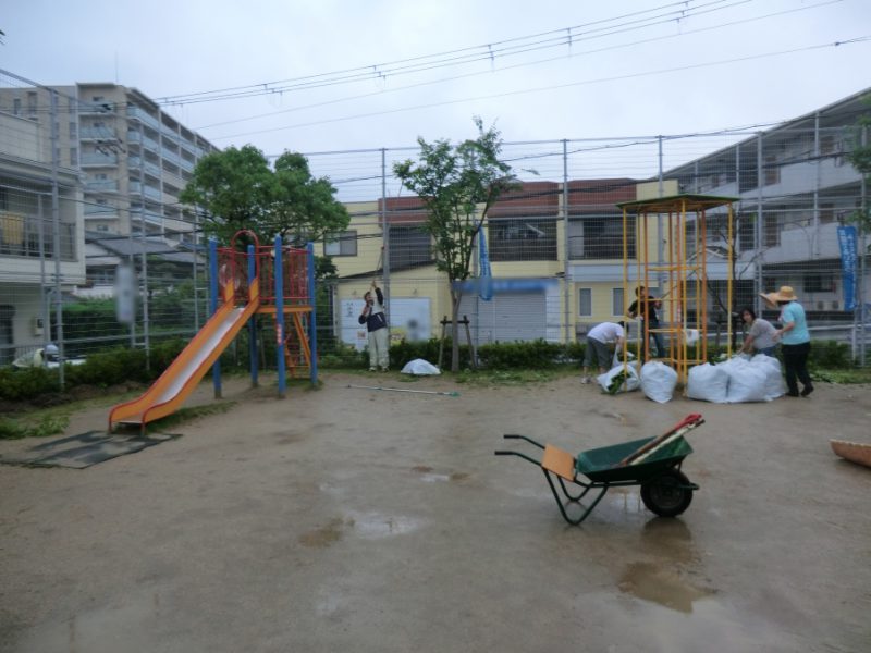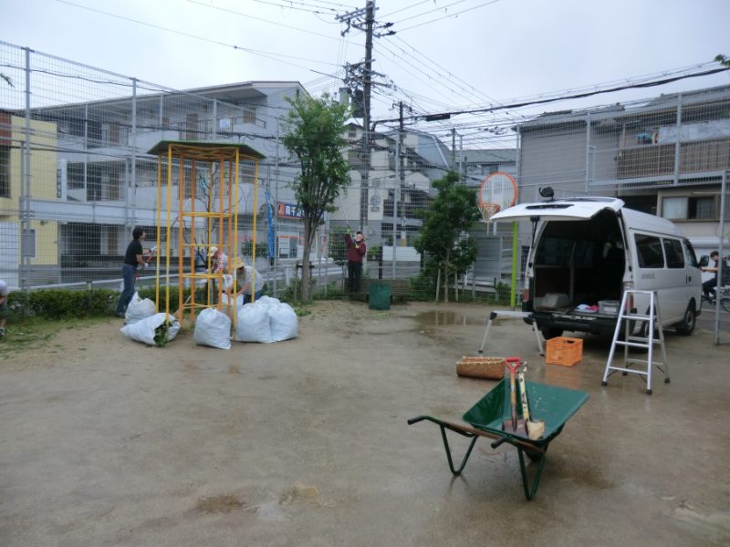 この事業は、児童センターからの委託事業で行っていますが、側溝の清掃は契約外ですので、まったくのボランティアです。側溝の砂を広場に戻すのですが、今日は水を含んで重たくなっています。まち協の若手(?)が頑張っています。これから暑くなると、毛虫の発生も予測されますので、高木の剪定も行いました。予想をより早く雨が降ってきましたので、皆さんずぶぬれです。しかし、炎天下ではなかったし、蚊もでませんでしたので、例年と比べると幾分楽なような気がしました。いつもなら、作業終了後みんなでお弁当を食べながら懇談するのですが、本日は雨のため、 10時30分には解散となりました。皆さんご苦労様でした。