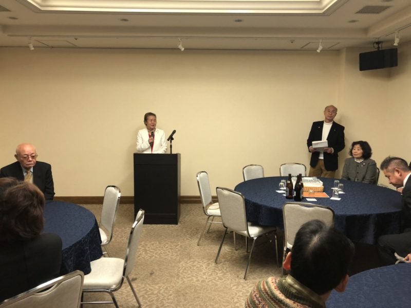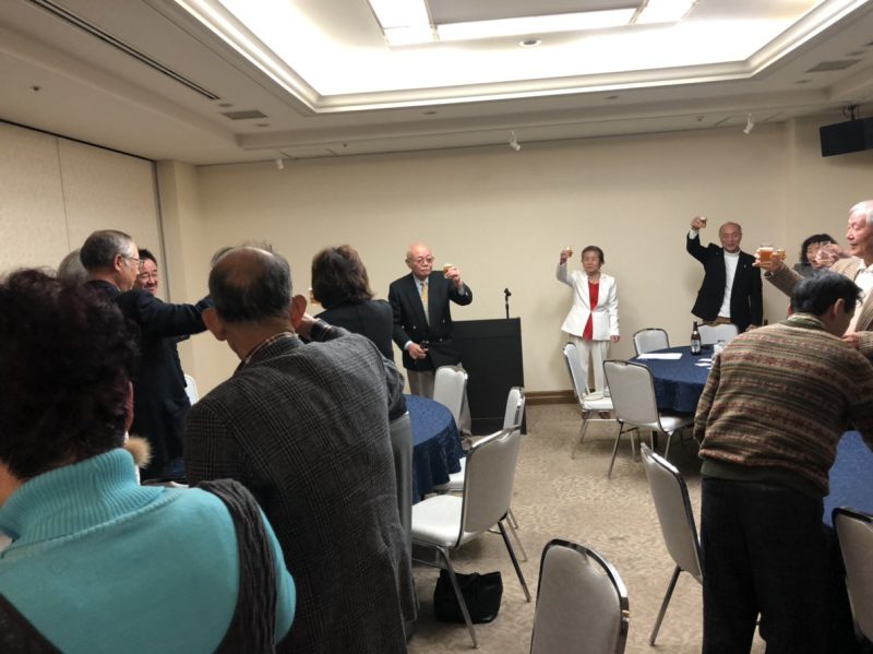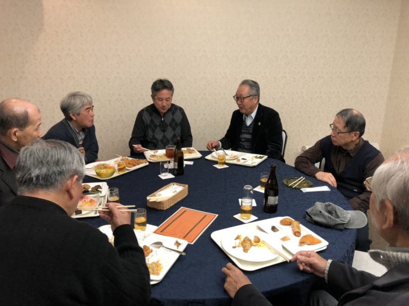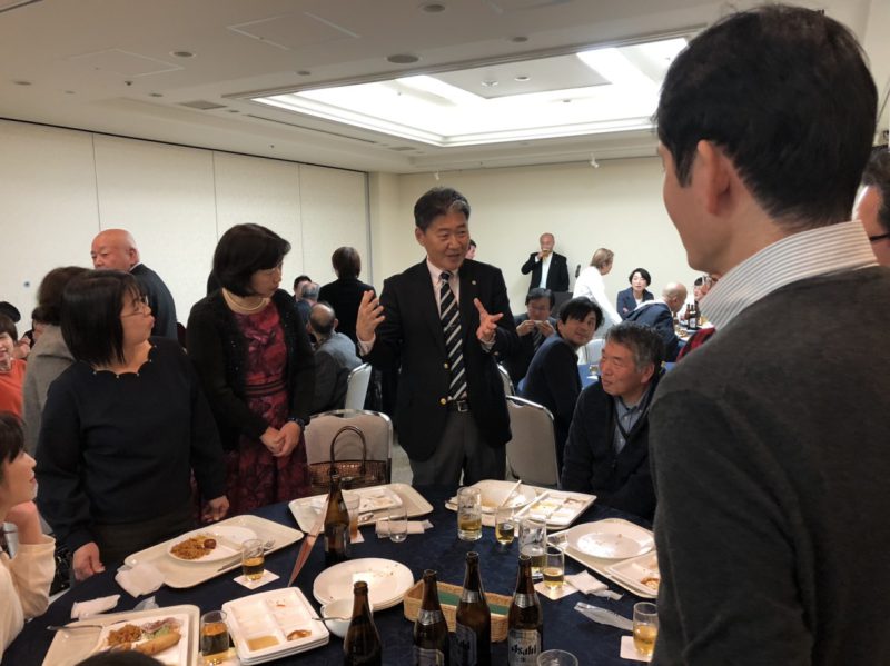新年会は、諏訪会長の新年の挨拶と出口連合自治会長の乾杯の発声の後、和やかなムードで始まりました。今年は、たくさんの方々が参加(総数74名)され、また、ご来賓として後藤市長をはじめ国会、府会、市会の各議員にもご出席を賜り、新年のご挨拶と簡単なスピーチをいただきました。皆さん、千里新田地区のチームワークの良さと、各事業の実行力を称賛してくださいました。