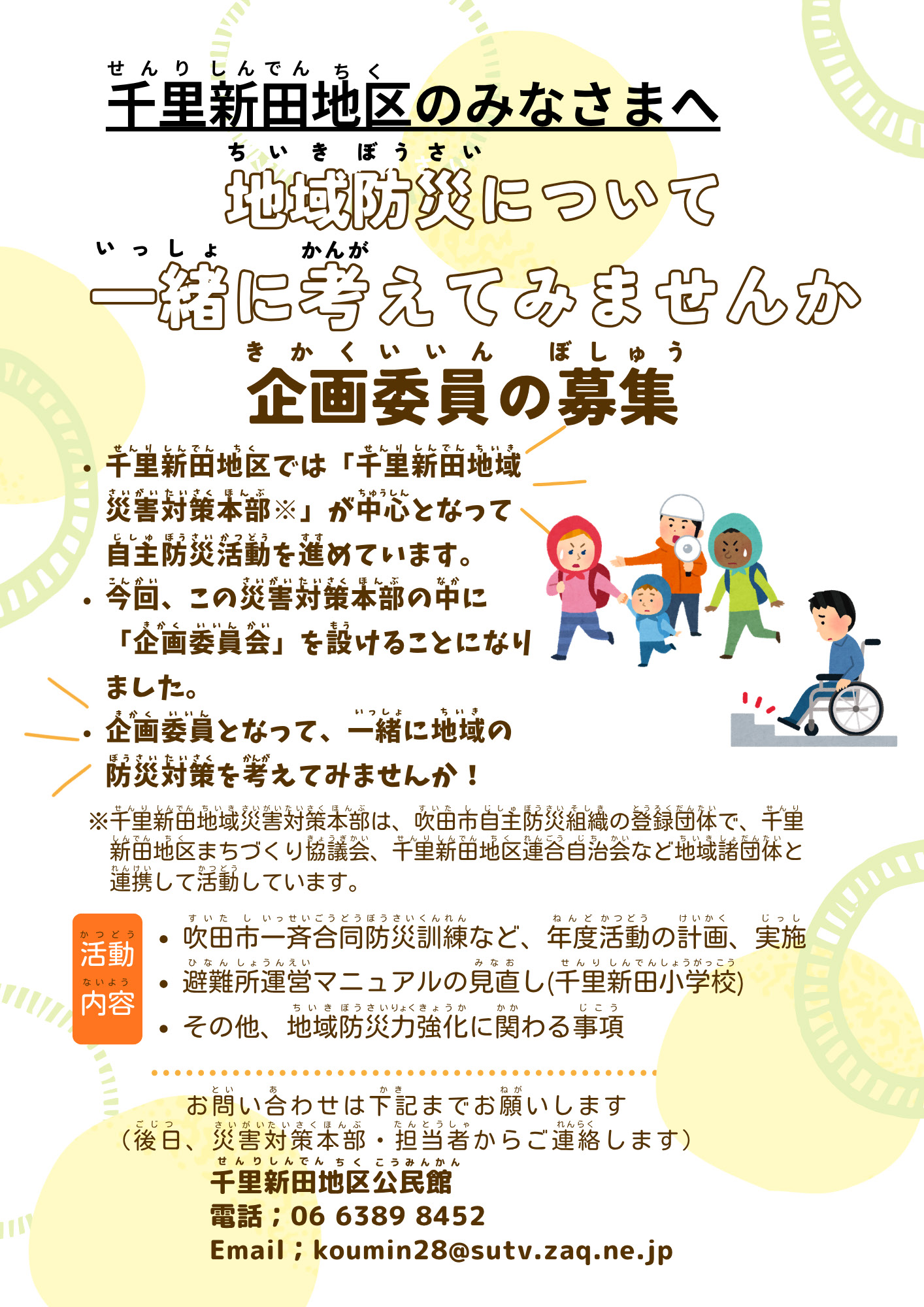 お知らせ 【募集】企画委員として地域防災について一緒に考えてみませんか 2026.04.19 「千里新田地域防災対策本部」の企画委員を募集しています!企画委員の募集チラシ(PDF)をダウンロードできます。(新しいタブで開きます。)