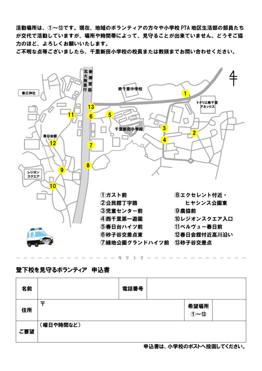 千里新田小学校を発着点として地区内をパトロールします。 - その他
