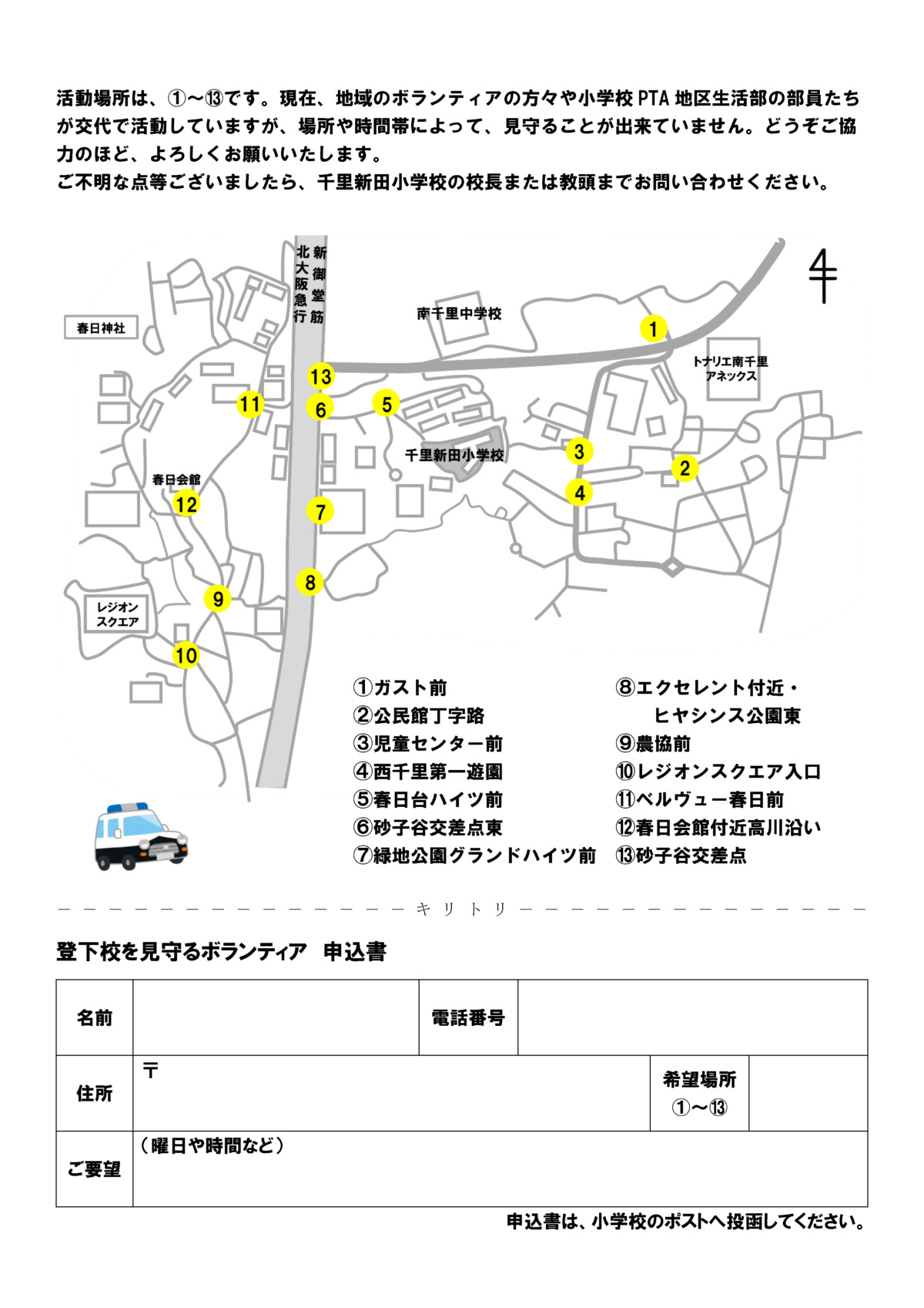 千里新田小学校を発着点として地区内をパトロールします。 - その他